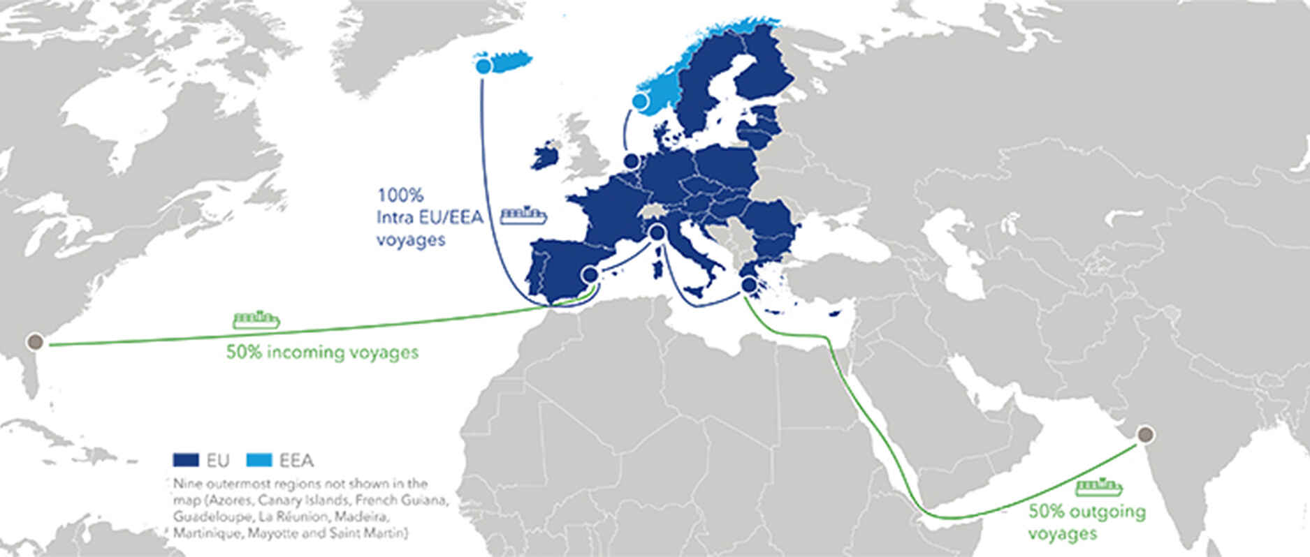 What does the system cover? The EU ETS covers 100% of the emissions that occur between two EU ports and when ships are within EU ports, and 50% of emissions from voyages starting or ending outside of the EU (allowing the third country to decide on appropriate action for the remaining share of emissions) (Figure 2). In detail it covers CO2 (carbon dioxide), CH4 (methane), and N2O (nitrous oxide) emissions, but the two latter only as from 2026.[10] To give enough phasing-in time for the companies regarding registering their emissions, preparing their inventories, accounting systems, etc. the Commission proposed that shipping companies will have to surrender allowances for a portion of their emissions during a phase-in divided into three periods: